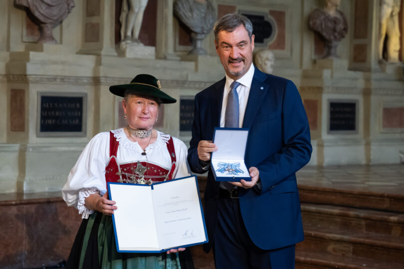 Der Ministerpräsident ehrte ie Trachtenschneidermeisterin aus Schliersee für ihren unermüdlichen Einsatz für die Trachtensache in Bayern und ihre Bemühungen, das traditionelle Gwand fit für die Zukunft zu machen. Auch ihre Arbeit bei der Errichtung des Trachtenkulturmuseums würdigte Söder: “Als Vorsitzende des Sachausschusses „Trachtenpflege und Trachtenforschung“ im Bayerischen Trachtenverband koordiniert sie die Arbeit der Gautrachtenwarte und organisiert Fachtagungen. Mit großem Einsatz gestaltete sie das Trachtenkulturzentrum in Holzhausen mit und betreut es bis heute mit großer Hingabe. Ihre Projekte und Ideen verbinden dabei stets Tradition mit Zukunft und zielen auf eine Verbreitung der Kenntnisse über das bayerische Gewand. Eine unverzichtbare Säule der Trachtenbewegung.“ Da spricht der Herr Ministerpräsident Dr. Markus Söder uns Trachtlern aus der Seele!