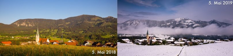 Kaum zu glauben: zwischen diesen beiden Aufnahmen liegt genau ein Jahr dazwischen. Jeweils am 5. Mai stand der Fotograf oberhalb von Törwang und schaute über den Samerberger Hauptort Törwang hinüber in die Hochries-Bergwelt. Während vor einem Jahr eher das Mähwerk angerückt kam, war heuer noch Verdacht auf den Schneepflug. Die Gegenüberstellung zeigt, wie unterschiedlich sich zum Frühjahr das Wetter entwickeln kann.