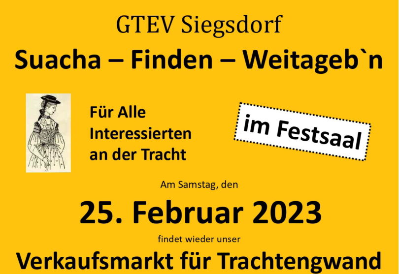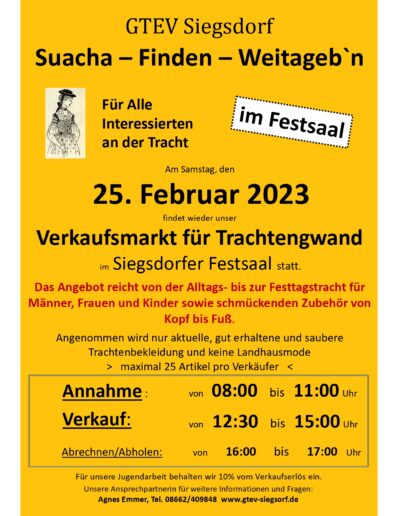 am 25. Februar 2023im Siegsdorfer Festsaal Das Angebot reicht von der Alltags- bis zur Festtagstracht für Männer, Frauen und Kinder sowie schmückendem Zubehör von Kopf bis Fuß. Angenommen wird nur aktuelle, gut erhaltene und saubere Trachtenkleidung (keine Landhausmode) und maximal nur 25 Artikel pro Verkäufer.