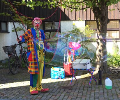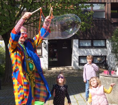 Beim gemütlichen Nachmittag mit Kaffee und Kuchen, sowie fairen Süßigkeiten für alle Kinder im Pfarrzentrum unterhielt Clown Pedro die Kinder und ihre Familien mit Seifenblasen aller Größen, andere durften mit Michi Galler von der Lebenshilfe trommeln. Geschicklichkeitsspiele und Torwandschießen, sowie das Bildermalen zum Thema „Wasser“ sorgten für Spaß. Die drei Gewinner beim Torwandschießen durften sich jeweils über einen fair produzierten Ball freuen.