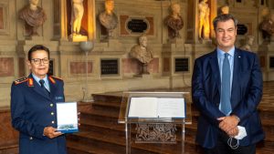 Bayerns Ministerpraesident Markus Soeder verleiht am Donnerstag (08.07.21) in der Residenz in Muenchen den Bayerischen Verdienstorden an Gesine Krueger.