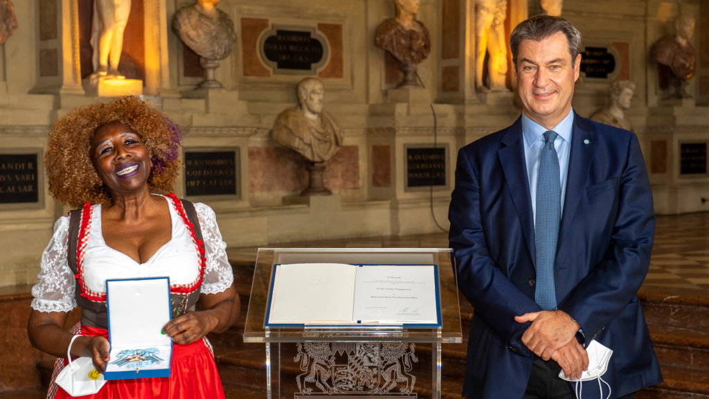 Bayerns Ministerpraesident Markus Soeder verleiht am Donnerstag (08.07.21) in der Residenz in Muenchen den Bayerischen Verdienstorden an Asha Noppeney.