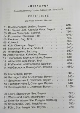 Der Liendlhof steht nun bis Mitte Juli im Zeichen von Christian Ecklers gefälligen Aquarellen, die man sich nicht entgehen lassen sollte. Dr. Irmingard Weises Traum, den ehemaligen Kuhstall ihres Bauernhofs zu einer Anlaufstelle für Interessierte der Bildenden Künste und einen Ort der Inspiration und Begegnung zu machen, hat sich jetzt schon erfüllt – der Ort ist etwas ganz besonderes und eine Bereicherung des Priener Kulturlebens.