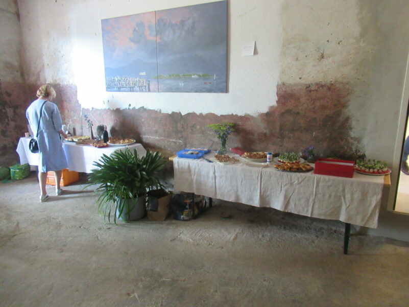 Christian Eckler machte es dann erfreulich kurz. Er freute sich über die vielen Besucher. Die Atmosphäre eines ehemaligen Kuhstalls als Ausstellungsort habe ihn besonders gereizt, denn hier kann er seine Aquarelle in einem Ambiente zeigen, das eine gewisse Verbindung zur freien Natur hat. Auslösender Impuls sei für ihn das Sehen und Erleben. Eckler wies dann noch darauf hin, dass auf der rechten Seite des Stalls Bilder aus deutschsprachigen Ländern sind und auf der linken Seite Bilder aus fremdsprachigen Ländern. Als Besonderheit hatte er für den Abend ein Bilderrätsel vorgesehen, bei dem man von 12 Bilderausschnitten die Herkunft erraten musste und die Chance hatte, ein Original seiner Werke zu gewinnen.