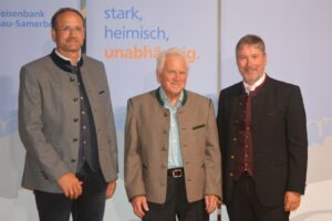 Josef Troßbach aus Samerberg (Mitte) wurde bei der 143. Generalversammlung der Raiffeisenbank Aschau-Samerberg in der Frasdorfer Lamstoahalle wieder in den Aufsichtsrat gewählt. Es gratulieren Vorstand Daniel Sauer (links) und der Vorstandsvorsitzende Christian Trattner (rechts).