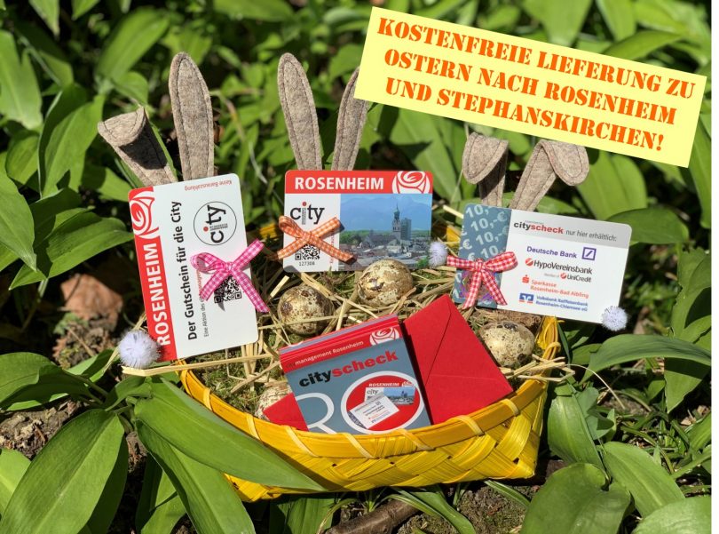 Für alle gilt auch an Ostern das Motto „wir-bleiben-zu-Hause“ und deshalb kann man seine Lieben, die nicht im selben Haushalt leben, leider nicht treffen und zusammen die Feiertage begehen. Damit man diesen an Ostern aber auch etwas schenken kann, bietet das City-Management einen kostenfreien Lieferservice für Rosenheimer cityschecks an, wenn diese Menschen in Rosenheim oder Stephanskirchen leben. Auf Wunsch auch mit einer persönlichen Grußbotschaft. Einfach cityschecks unter www.ro-city.de/osteraktion-cityscheck bis einschließlich Donnerstag, 9.4., auf Rechnung bestellen. Diese werden dann bis einschließlich zum Ostersamstag ausgeliefert. Der Gutschein wird in knapp 100 Betrieben in der Rosenheimer Innenstadt angenommen. Da ist für jeden Geschmack etwas dabei!