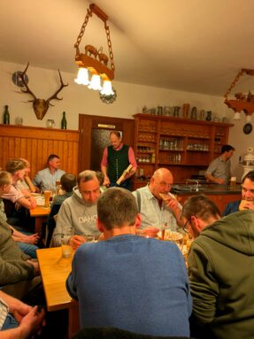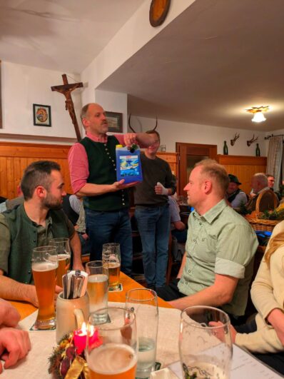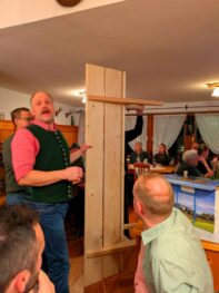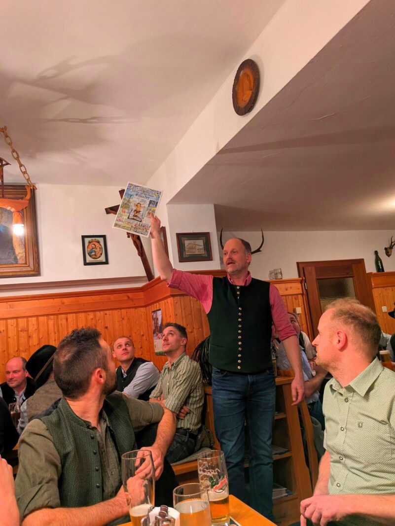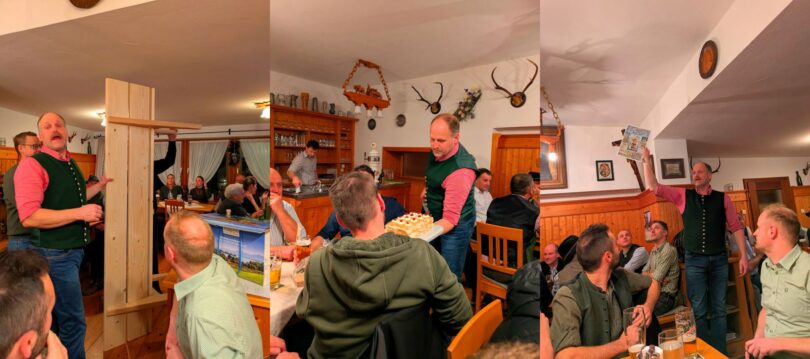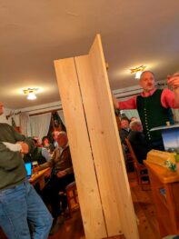 Die kurzweilige Versteigerung wurde sodann wieder gekonnt vom Vereinsmitglied Josef Wörndl durchgeführt, der zwischen den einzelnen Geboten mit lustigen Witzen für Abwechslung und gute Stimmung unter den Anwesenden sorgte. Zu den versteigerten Waren zählten neben zahlreichen kulinarischen Köstlichkeiten wie Schnäpsen, Fisch-, Fleisch- und Wurstwaren auch originelle Sachspenden, darunter selbstgestrickte Kindersocken, ein Vogelhaus, eine Mistgabel und ein Gutschein für 1,4 Kubikmeter Hartholz. Für besonderes Aufsehen sorgte eine Holzbank, die vom Vereinsmitglied Hans Bauer gestiftet wurde und letztlich mit 300 Euro auch den Höchstpreis am Abend erzielte.