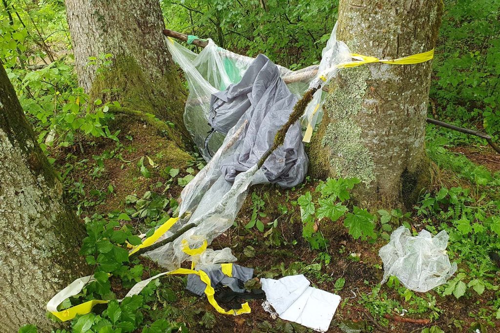 Kein schöner Anblick, aber leider kein seltener: Besucher lassen im Nationalpark Berchtesgaden in diesem Jahr vor allem am Königssee vermehrt Müll zurück, campieren oder entzünden Lagerfeuer. Dieses behelfsmäßige „Zelt“ entsorgten Camper am Ostufer des Königssees. Verstöße gegen die Nationalparkverordnung werden von den Rangerinnen und Rangern konsequent verfolgt und zur Anzeige gebracht.