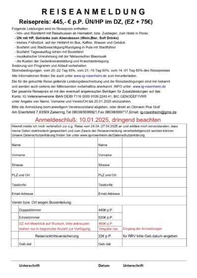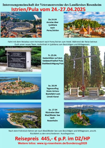 Am Freitag, 25. April ist die traditionelle Gedenkfeier auf dem Soldatenfriedhof Pula vorgesehen, am Samstag, 26. April ein Tagesausflug entlang der Küste Istriens und eine Bootsfahrt zum Limski-Kanal. Bei der Anreise ist ein Zwischenaufenthalt in Ljubliana und bei der Abreise am Bleder See/ Bled eingeplant. Die Reise ist nicht nur für Vereinsmitglieder offen, sondern für alle die gerne einmal einen deutschen Soldatenfriedhof besuchen wollen oder den Soldatenfriedhof auf dem ihre Familienangehörigen bestattet sind. Anmeldeschluss für die Reise nach Pula ist am 10. Januar. Das Reiseprogramm und die Informationen können über Internetseite der IG Rosenheim unter www.ig-rosenheim.de/Sonderzug2025 eingesehen und heruntergeladen werden.