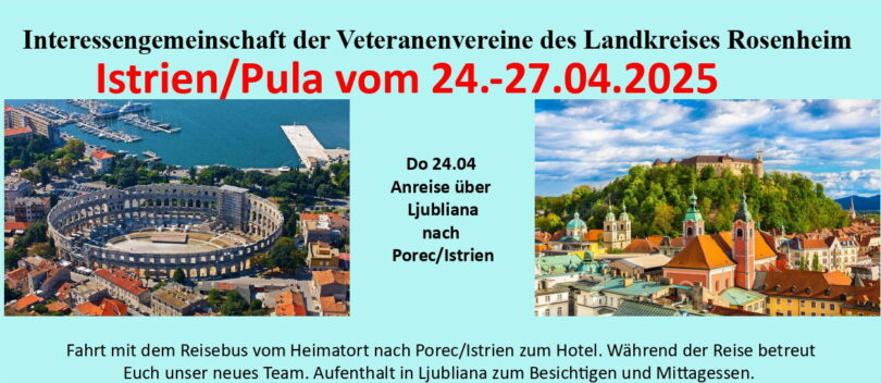 Die Interessengemeinschaft (IG Rosenheim) der Krieger-, Veteranenvereine und Soldatenkameradschaften im Landkreis Rosenheim fährt in diesem Jahr vom Donnerstag, 24. April bis Sonntag, 27. April mit Bussen nach Pula in Istrien. Alle Teilnehmer der Reise sind in der Hotelsiedlung Plava Laguna – Porec untergebracht.