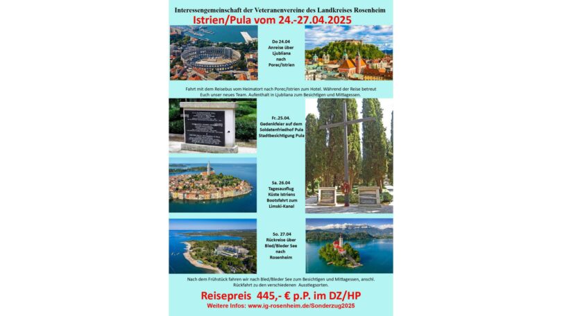 Der 1. Obmann der IG Krieger-, Veteranenvereine und Soldatenkameradschaften im Landkreis Rosenheim e.V., Pius, informiert über die anstehende Reise nach Istrien/Pula im April 2025.