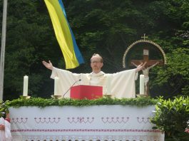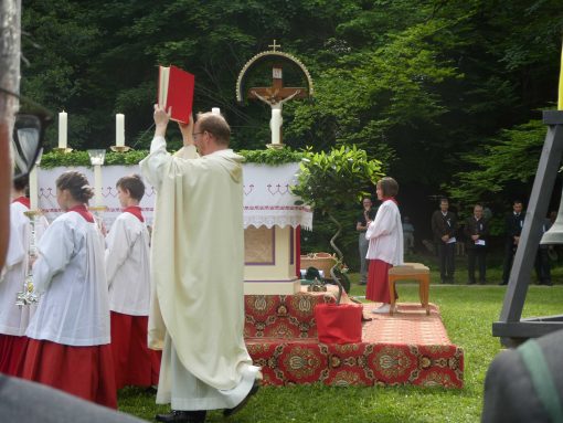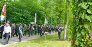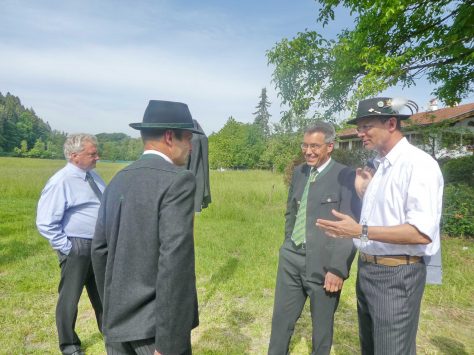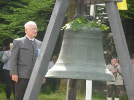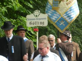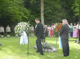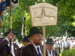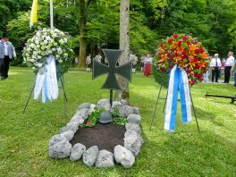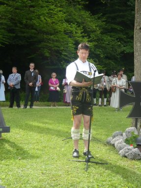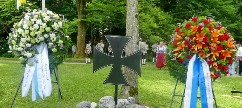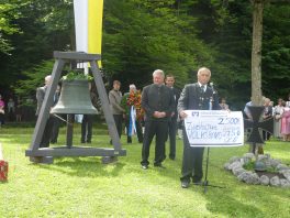 Der Gottesdienst mit Volksgesang wurde musikalisch von der Festmusikkapelle Prien unter der Leitung von Sebastian Strohmayer gestaltet. Die Idylle des Festplatzes im Großen Kurgarten im Eichental war geprägt von fleißigen Kuckucks-Rufen und vom ständigen Rauschen des Prien-Wassers. Unterbrochen wurde die Idylle nur durch den Kanonensalut bei der Wandlung und durch den abschließenden Ehrensalut der Priener Gebirgsschützen. Die Kirchenkollekte wird zu je einer Hälfte der Aktion für das Leben in Rosenheim und der Kriegsgräberfürsorge zur Verfügung gestellt. Wie Pius Graf aus Zaisering als erster Obmann der Interessengemeinschaft der Krieger- und Veteranenvereine sowie der Soldatenkameradschaften im Landkreis Rosenheim im Beisein seiner Stellvertreter Sebastian Fodermeyer aus Babensham und Josef Beer aus Bruckmühl in seinem Grußwort sagte, gilt es weiter am Frieden zu bauen und an den Gedenkstätten für die verstorbenen Kameraden festzuhalten. In diesem Sinne übergab er einen Scheck in Höhe von 2.500 Euro an Heinrich Rehberg, dem Vorstand des Bezirks Oberbayern innerhalb des Vereins Volksbund Deutsche Kriegsgräberfürsorge. Rehberg dankte dafür mit den Worten: „Mit diesen 2.500 Euro können 50 Gräber renoviert oder 250 Gräber bepflanzt werden. Zudem können Arbeitseinsätze und Schulklassen-Aufenthalte bezuschusst werden. Bayern allein sammelt die Hälfte des deutschen Spendenaufkommens und in Bayern kommt die Hälfte aus Oberbayern“. Pius Graf ergänzte diese Informationen mit dem Grundsatz, dass Gräberpflege und Friedenssicherung nicht nur Aufgabe von Staat und Vereinen, sondern insbesondere vom Volk und von jedem einzelnen Bürger abverlangt werden sollten. Bei der Kranzniederlegung für die verstorbenen Kameraden schlug Ehrenvorsitzender Michael Anner eine eigens ins Eichental gebrachte Kirchenglocke an, über dessen besondere Geschichte noch eigens berichtet wird. Unter den zahlreichen Ehrengästen konnten von Erstem Vorstand Georg Fischer unter anderem die Landtagsabgeordneten Klaus Stöttner und Otto Lederer, die Bezirksräte Sebastian Friesinger und Sepp Hofer, stellvertretender Landrat Josef Huber sowie Bayernbund-Ehrenvorsitzender Adolf Dinglreiter begrüßt werden.
