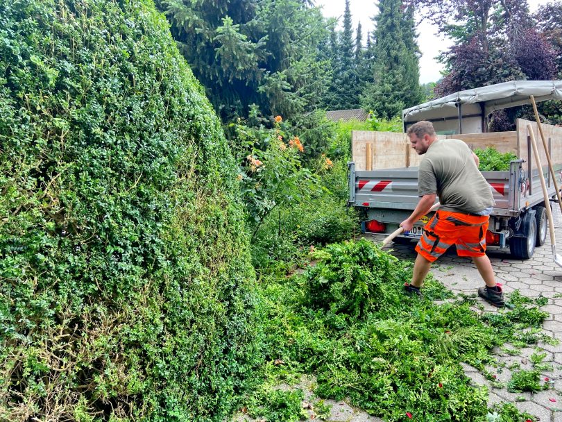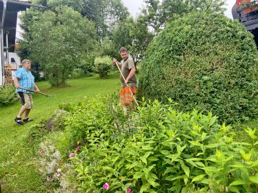 Ein besonders einladendes und schönes Festzelt soll es werden, wenn ab Donnerstag, 23. Juni die Festlichkeiten am Hohertinger Weg in Prien mit dem Bieranstich zum Jubiläum “125 Jahre Markterhebung” beginnen. Damit die Frauen von Prien und aus den Ortsvereinen auch genügend Material haben, waren Peter Dangl und Sebastian Riedl vom der gemeindlichen Bauhof-Gärtnerei schon eifrig unterwegs, um Buchs-Zweige einzusammeln. Unsere Aufnahmen entstanden in Prien-Prutdorf und sie zeigen, dass für die bestimmt wieder geschickten Frauenhände viele Zweige von der immergrünen Pflanze zusammengekommen sind.