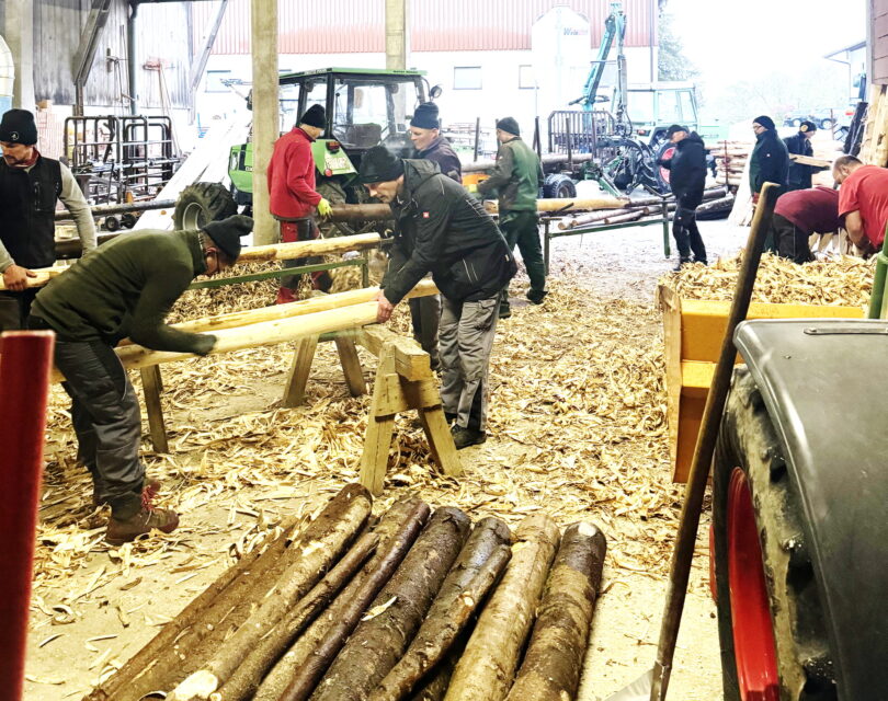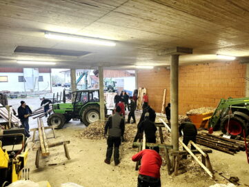 Aufgrund des schlechten Wetters wurde der Arbeitseinsatz kurzfristig in die Maschinenhalle unseres Feuerwehrkameraden Hermann Oischinger verlegt. Dort wurden mehr als 300 Stempen und etwa 250 laufende Meter Stangen für den Bühnenbau und den Festzeltaußenbereich hergerichtet. Ein besonderer Dank galt den Waldbesitzern Andreas Böck, Johannes Buchner, Georg Kink, Hermann Oischinger und Franz Wimmer für ihre Holzspenden.