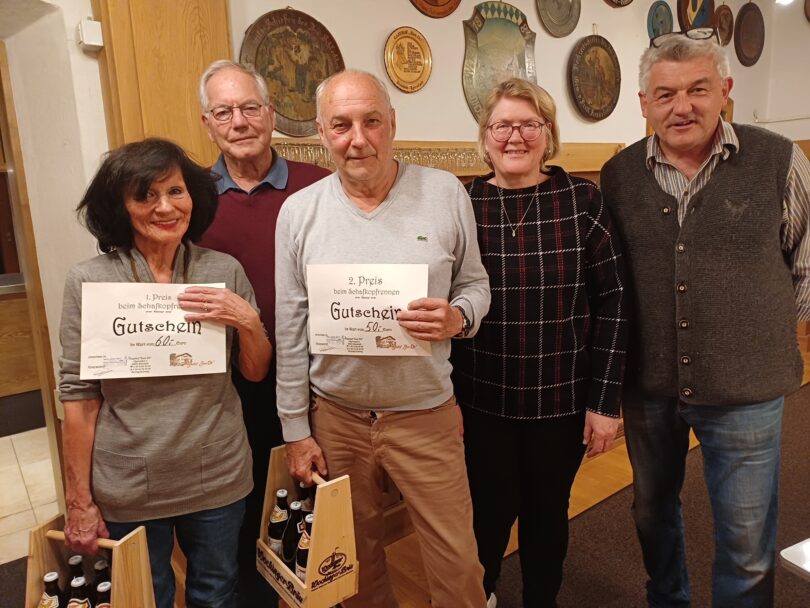 Nach durchweg fairen, harmonischen „Kämpfen“ an 21 Tischen wurden Marlies Lemberger aus Reit im Winkl und Willi Sedlmayer aus Grassau mit jeweils 164 Punkten Beste, wobei Lemberger sieben Herzsoli gewann und Sedlmayr fünf. Dritter mit 162 Punkten wurde Dieter Hangel aus Übersee und dicht auf mit 161 Punkten Barbara Angerer aus Grassau. Es gab Essensgutscheine und Bierpreise für die Besten sowie die traditionellen Fleischpreise für die drei Tischbesten. Das Foto zeigt (von links) Marlies Lemberger, Dieter Hangel, Willi Seldmayer, Barbara Angerer und Spielführer und Wirt Franz Peikert.