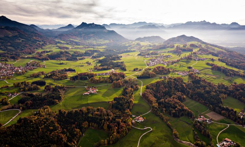 Vier Kirchen in den ehemals vier selbstständigen Gemeinden Grainbach, Rossholzen, Steinkirchen und Törwang gehören zur Gemeinde Samerberg. Sie alle auf einmal zu erkennen  ist am Boden nur schwer möglich. Mit dieser jüngst vorgenommenen Aufnahme an einem schönen Herbsttag gelang eine Aufnahme, auf der alle vier Gemeindeteile und damit die Standorte der Kirchen zu finden sind.