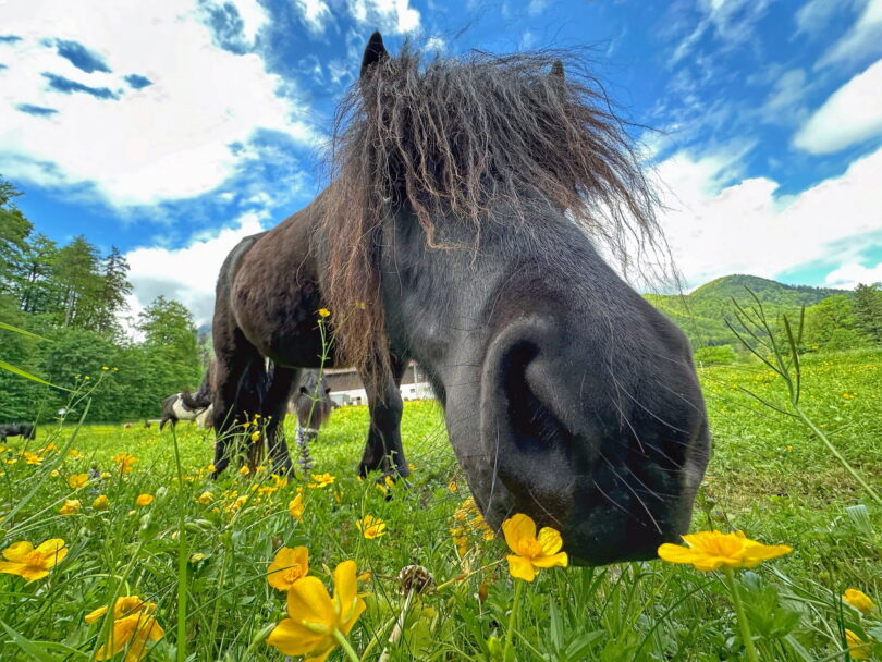 Was für eine coole Schnauze, dieses Pony vom Kiesmüller Hof in Aschau i.Chiemgau. Das satte Grün und die strahlende Blumenwiese sind nicht nur für uns Menschen ein Genuss, sondern sichtlich auch für die Vierbeiner.