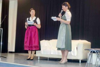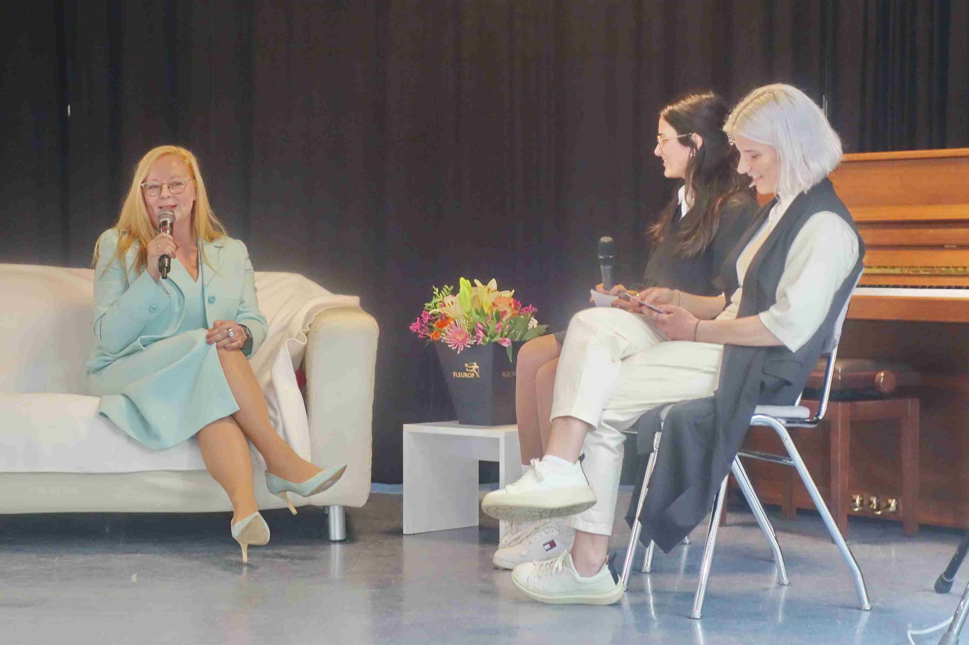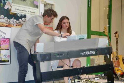 Heiter und doch auch nachdenkenswert war ein Couch-Gespräch von Maria Beer und Tiara Vollmer von der Schülerzeitung. Dabei erinnerte die Schulleiterin, dass sie ursprünglich Schauspielerin oder Journalistin hätte werden wollen. Doch die Wohnnähe zu den Regensburger Domspatzen ergab, dass sie im Rahmen einer Aushilfe in das Lehramt hineinschnupperte, Gefallen fand und diesen bis heute behielt. Sie gab auch Einblick, dass sie Literatur abwechselnd in englischer und deutscher Sprache lese und dass sie auch ein Harry-Potter-Fan ist. Auf die Frage zur Künstlichen Intelligenz sagte sie: „Im Schulalltag und im modernen Unterricht können wir nicht den Kopf in den Sand stecken und die KI ignorieren, das funktioniert nicht. Die KI wird ebenso wie das Internet, dort wo es Sinn gibt, im Unterricht eingebunden werden müssen“.