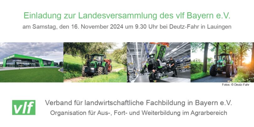 Der Verband für landwirtschaftliche Fachbildung in Bayern e.V. lädt am Samstag, den 16. November 2024, zur Landesversammlung in die Deutz-Fahr Arena in Lauingen ein.