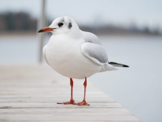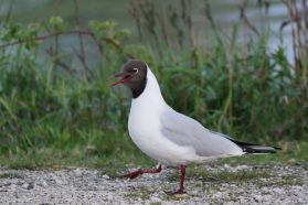 Die Lachmöwe zählt zu den kleineren Möwenarten und ist in etwa so groß wie eine Ringeltaube. Auffallendes Merkmal dieser Möwe ist der schokoladenbraune Kopf mit den weiß umrandeten Augen. Diese „Gesichts-Maske“, die nur zur Brutzeit getragen wird, sieht aus wie eine Kapuze, die nicht ganz bis in den Nacken reicht. Jetzt im Schlichtkleid ist der Kopf hell mit einem dunklen Ohrenfleck.