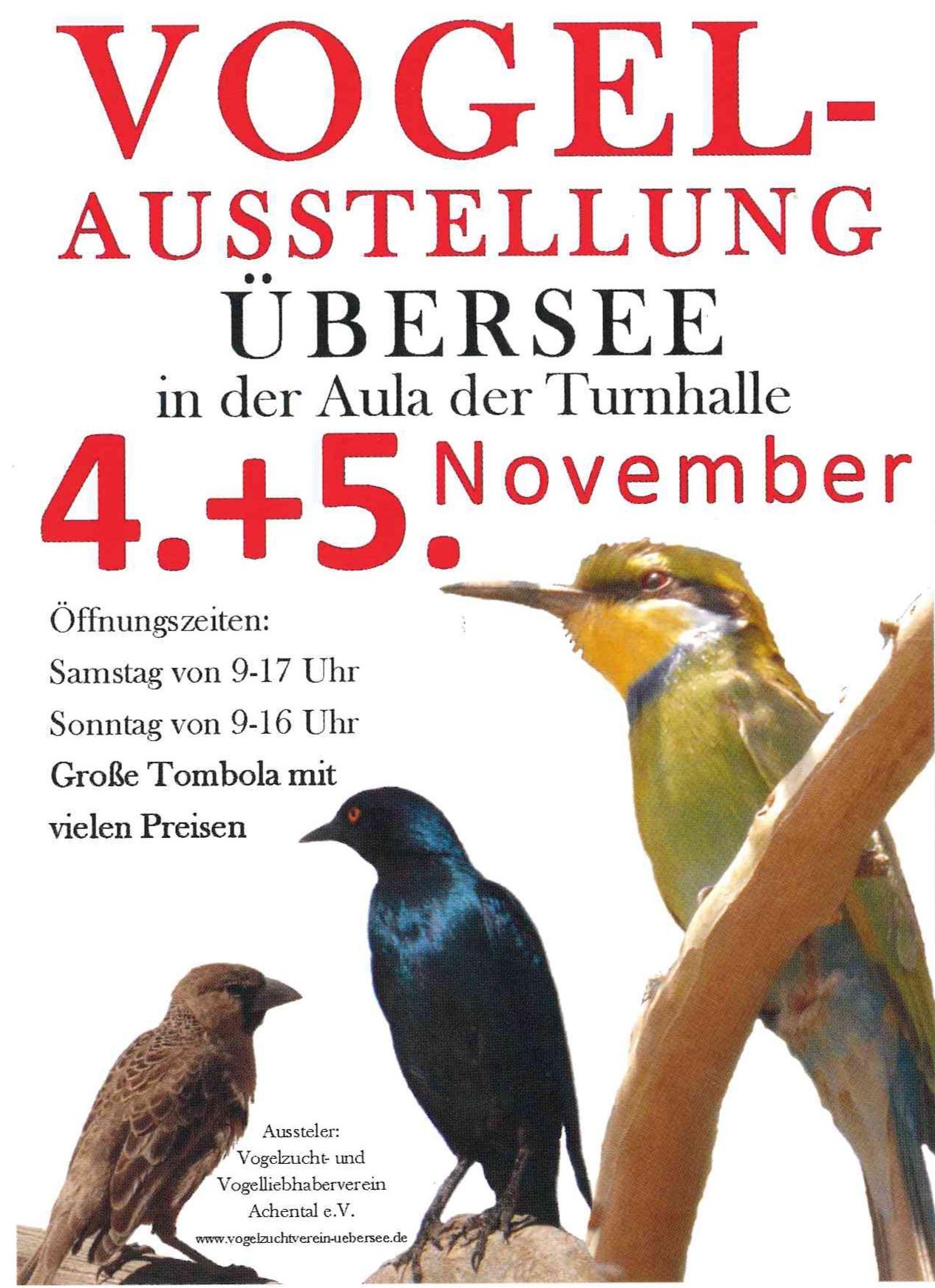 In der Aula der Turnhalle von Übersee veranstaltet der Vogelzucht- und Vogelliebhaberverein Achental e.V. am Samstag, 4. November und am Sonntag, 5. November eine Vogelausstellung.. Die Öffnungszeiten sind am Samstag von 9 Uhr bis 17 Uhr und am Sonntag von 9 Uhr bis 16 Uhr. Im Rahmen der Ausstellung gibt es auch eine große Tombola mit vielen Preisen.