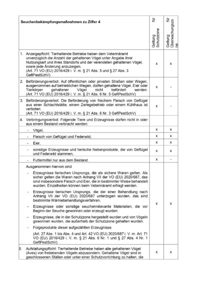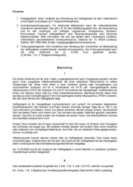 Um die Infektionsgefahr einzudämmen, richtet das Staatliche Veterinäramt eine drei Kilometer Radius umfassende Schutzzone (Gemeinden Ergoldsbach und Hohent-hann) ein, umrahmt von einer zehn Kilometer umfassenden Überwachungszone (Neu-fahrn, Bayerbach, Postau, Essenbach, Ergolding, Rottenburg sowie Teile der Land-kreise Straubing-Bogen, Regensburg und Kelheim). In diesem Bereich werden Hal-tungs-, Handels- und Transportbeschränkungen für ansässige Geflügelhalter zu Tra-gen kommen. Diese gelten bis auf weiteres, mindestens aber bis Anfang/Mitte März. Eine genaue Übersicht und die entsprechenden Auflagen sind auf www.landkreis-landshut.de zu finden. Anträge auf Ausnahmegenehmigungen zu den Verbringungsverboten können per E-Mail an Vogelgrippe@landkreis-landshut.de gestellt werden.
