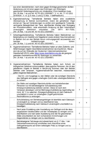 Das Friedrich-Löffler-Institut veröffentlicht auf seiner Homepage regelmäßig Risikoein-schätzungen zu diesem Thema. Hier sind auch weitere Biosicherheitsmaßnahmen aufgeführt, die Geflügelhalter zum Schutz ihrer Bestände treffen sollten: https://www.fli.de/de/aktuelles/tierseuchengeschehen/aviaere-influenza-ai-gefluegel-pest/