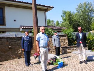- Die Besucher aus Oberbayern unter Leitung des neuen Bezirksvorsitzenden Heinrich Rehberg (links) und des neuen Bezirksgeschäftsführers Artur Klein (rechts) legten ein Blumengesteck mit einer Kranzschleife des Volksbundes am zentralen Hochkreuz nieder und sprachen ein gemeinsames Gebet.