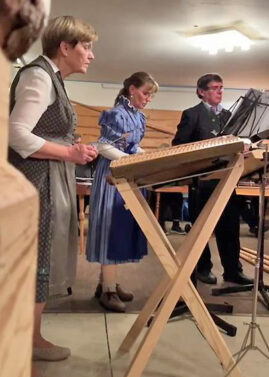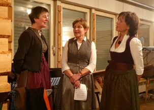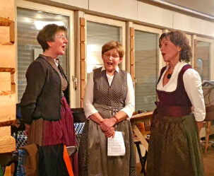 Ein Highlight war der Frauen-Dreigesang Kleinmachnow. Dieser hat sich, ebenso wie das Hackbrett-Consort, erst im letzten Jahr zusammengefunden. Irmgart Mann hat sich hierbei statt mit dem Hackbrett, mit ihrer Stimme eingebracht. Zusammen mit Johanna Einspanier aus Oberbayern und Waltraud Kruck aus Österreich pflegt sie diese alpenländische Gesangstradition in Kleinmachnow, hinter der Stadtgrenze von Berlin. Das Besondere beim Dreigesang ist, dass dreistimmige Volksmusikstücke von einem Gesangs-Trio a Cappella vorgetragen werden. Nach den stimmungsvollen Gesangseinlagen der drei Damen dann alpenländische Lieder auf der Harmonika vom Steirer-Virtuosen Thomas Bräuer, ebenfalls Mitglied beim Verein der Bayern. Dazu gab es ein weiteres Highlight des Abends, der Königsjodler von der Jodelmoni. Nach einem abwechslungsreichen Konzert der beteiligen Musikgruppen folgte gemeinsam der Andachtsjodler. Am Ende des Konzerts hieß es dann „Servus, pfüat Gott und auf Wiederseh’n“.