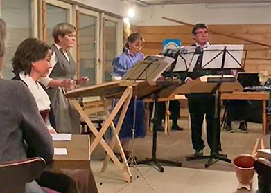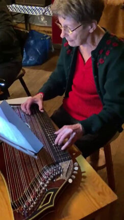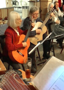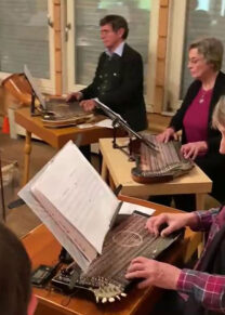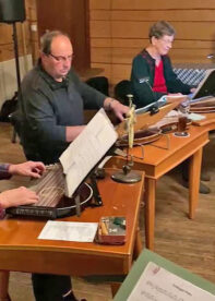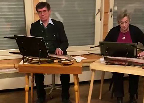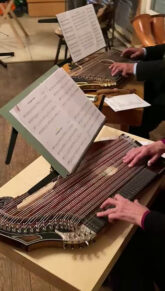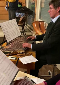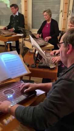 Nach der Begrüßung der Musiker und Gäste durch den Vorsitzenden des „Vereins der Bayern in Berlin“ präsentierte sich das neu gründete Hackbrett Consort Kleinmachnow, unter der Leitung von Irmgard Mann. Sie ist gebürtig aus Bayerisch-Schwaben und seit 30 Jahren Organistin an der Katholischen Kirche St. Thomas Morus, Kleinmachnow. Mit Denis Pinta, Ines von Nolting und Helmut Amberger hat sie das Hackbrett-Ensemble initiiert. Nach einem ersten Set klangvoller Hackbrett-Stücke folgte der Zitherspielkreis Berlin 1878. Dieser pflegt, seit „sage und schreibe“ 146 Jahren die Tradition des Saitenspiels in Berlin. Astrid Belschner, Vorsitzende vom Landesverband Berlin-Brandenburg des Deutschen Zitherbundes, stellte das Ensemble vor. Dabei ging sie kurz auf Historie des Zitherspielkreises und auch des Zitherspiels an sich ein. Nicht nur auf der Zither, auch mit ihrer Stimme begleitete die passionierte Kammersängerin das Zither-Ensemble. Neben Astrid mit an der Zither Hella Poser, Katrin Römer, Dietmar Geßner und Helmut Amberger. Dazu an der Gitarre Monika Porsch und Julia Glatzel.