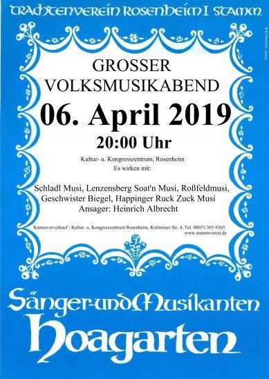 Am Samstag, den 06. April 2019, veranstaltet der GTEV Rosenheim I-Stamm e.V. ab 20:00 Uhr seinen großen Volksmusikabend im Kultur- und Kongresszentrum Rosenheim. Beginn ist um 20:00 Uhr.