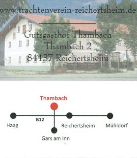 Am Kirchweihmontag, 16. Oktober veranstaltet der Trachtenverein Reichertsheim den traditionellen Kirchweihmontag-Volksmusikabend. Die Veranstaltung findet im Gutsgasthof Thambach statt, da der Rampl-Saal in Reichertsheim nicht mehr zur Verfügung steht. Ab 18 Uhr gibt es in der Gaststube des Gutsgasthofs ein Kesselfleischessen. Die Plätze für den Volksmusikabend im Saal sind bereits ausverkauft. Es erfolgt deshalb eine Videoübertragung vom Saal in die Gaststube. Mitwirkende am Volksmusikabend sind die Doiwinkl-Musi, die Goidreif-Dirndl, die Schlechinger Sänger, die Obertaufkirchner Volksmusik und als Sprecher Bert Lindauer.