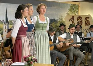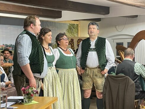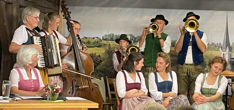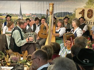 Die aus dem Rottal stammende Vilsleit’n Musi wartete mit einem heute selten gewordenen Bandoneon im Wechsel mit einer Gitarre, einer Harfe und einer steirischen Ziach auf und interpretierte gekonnt bekannte und unbekanntere Stücke. Den aus dem südlichen Landkreis Ebersberg kommenden Oimbliah Dreigsang verbindet nicht nur eine lange Freundschaft, sondern auch die Liebe zur Volksmusik. Sie legen viel Herzblut in ihre besonderen Lieder, die sie zum Großteil selbst schreiben, so die Sprecherin. Der Herbst kam mit dem Dreigsang in den Saal mit „Braune Wies, nosse Steigal“ und „Da Nebe ziahgt eina“. „Musikanten des woaß i“, „De Liab is a lange Roas“ und „Da Dog gibt sei Leuchtn auf“ komplettierten, von zwei Gitarren begleitet, den bunten Strauß an Liedern. Beschwingt begann die Familienmusik Ernst mit dem aus Musik und Gesang bestehenden Stück „Es ist schön, bei Euch zu sein“. Bei der in Schwindkirchen beheimateten musikalischen Familie spielen die beiden Elternteile, zwei Töchter und zwei Söhne Trompete, Akkordeon, Geige, Kontrabass, Basstrompete, Klarinette und Posaune und verstehen es ausgezeichnet, bodenständige Musik schmissig darzubieten. Beim Duschlhof G’sang, zwei Frauen und zwei Männer aus dem Rottal, ebenfalls familiär verbunden und diesmal allerdings mit einer Aushilfe, hieß es harmonisch und mit nicht oft gehörten Liedern „A guats Jahr is boid wieder umma“, „D‘ Arndt is eibrocht“, „Vom Häusl am Roa“, „Im Wirtshaus is lustig“ und „Oa Hoibe Bier, zwoa Hoibe Bier“.