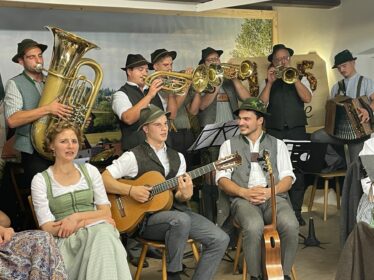 Schneidig leitete das HuabaBlech aus der Nähe von Eiselfing den Abend ein. Die Gruppe spielt gerne böhmische Stückl und besteht aus zwei Flügelhörnern, zwei Basstrompeten, einer Tuba und einer Steirischen Ziach, die von Sepp Huber, seinen drei Söhnen und zwei seiner Neffen gespielt werden.