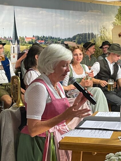Die Sprecherin Regina Schlemer aus Aschau „unterhalb der Kampenwand“, wie sie die Lage ihres Heimatortes beschrieb, führte feinsinnig und mit humorvollen Geschichten durch das Programm. Das HuabaBlech entstand aus einer Schnapsidee, berichtete sie. Die Söhne mussten sich bei der Weihnachtsfeier der befreundeten Innleitn-Musi verpflichten, bis zur nächsten Feier mindestens zwei Stücke gemeinsam spielen zu können. Die Verpflichtung wurde eingehalten und das war die Geburtsstunde des HuabaBlech. Wer am Kirta Hunger und Durst hat, der ist selber schuld, so die Ansagerin, und sie verwies auf das reichhaltige Kirtaessen, das von den Reischamer Trachtlern im Gutsgasthof aufgetischt wurde. Sie berichtete auch vom Kirtabier und einem Knecht, der es komisch fand, dass, je mehr Helles er getrunken hatte, es immer dunkler werde, bis er heimkomme.