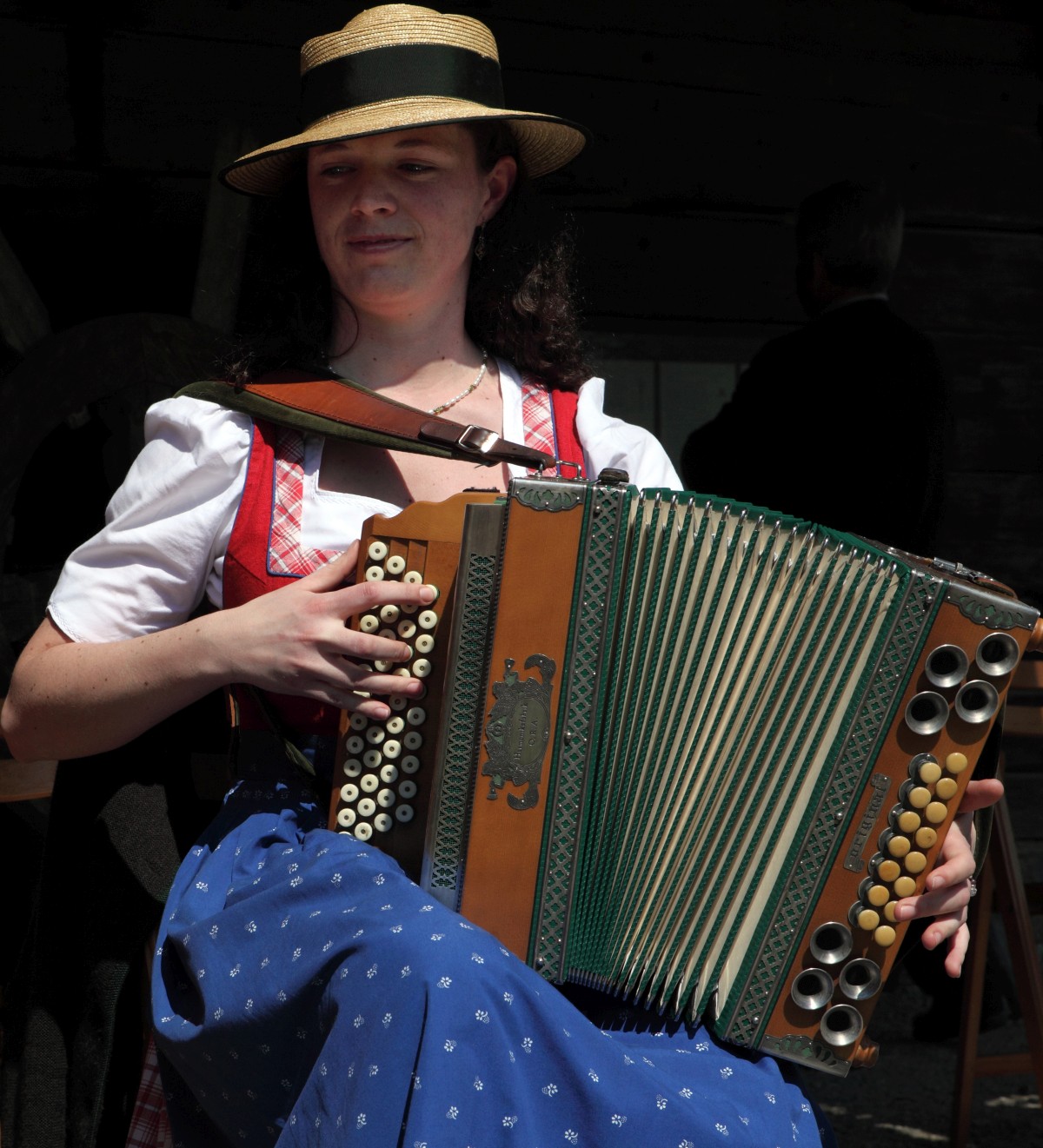 Ein typisches Instrument der alpenländischen Musik: die steirische Harmonika. Ihre charakteristischen Bässe und der Gleichton verleihen ihr einen einzigartigen Klang. © Bezirk Oberbayern, Archiv Bauernhausmuseum Amerang, Aufnahme: Gerhard Nixdorf.