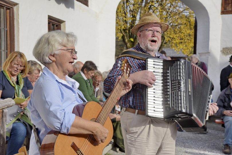 Bildunterschrift: –BHM_Volksmusiknachmittag_001.jpg: „Musik ist Balsam für die Seele!“ wissen Eva Bruckner und Ernst Schusser vom Volksmusikarchiv des Bezirks Oberbayern. Gerade in schwierigen Zeiten ist es wichtig – mit dem gebotenen Abstand – etwas für das eigene Wohlbefinden zu tun und handgemachte Musik zu hören. © Bezirk Oberbayern, Archiv Bauernhausmuseum Amerang, Aufnahme: Wilfried Herold.