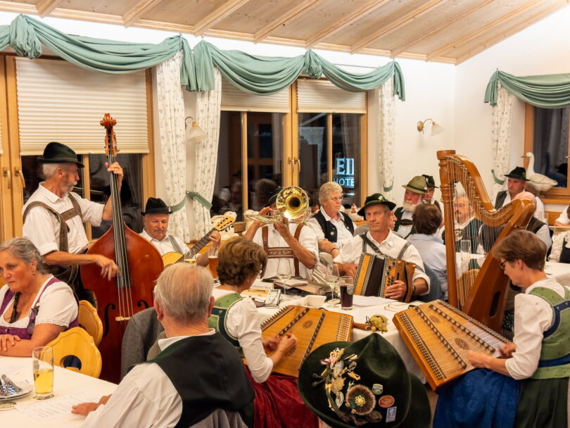 Den Anfang machten die „Agatharieder Bläser“ mit einem flotten Stückl. Zwischen den einzelnen Musikdarbietungen brachten Sie mit ihren Instrumenten, zwei Flügelhörnern, Baßtrompete und Tuba, mehrmals wunderschön klingende Weisen dar, teilweise sogar Eigenkompsitionen. Aus Garmisch und Umgebung kamen die Mitglieder der „Karwendelhüttn-Musi“. Mit ihrer vielseitigen und vielsaitigen Besetzung, angefangen bei Harfe, Hackbrett, Zither, Gitarre und Baß, verstärkt von Posaune und Diatonischer, konnten die sechs Musikanten in verschiedensten Besetzungen aufspielen und ein abwechslungsreiches Programm bieten. Die „Geschwister Demmel“, Maxi an der Zither und Kathi mit der Geige, begleitet vom Vater Max auf der Steirischen, spielten und sangen ursprüngliche Stücke, darunter auch das bekannte „Kraner Lied“. Ein weiterer stimmlicher Höhepunkt waren die Lieder des „Dreiwinkl-Gsang“. Begleitet von der Zither sangen Michi Scheil, Erika Dettendorfer und Tamara Kaltenberger Herbst- und Jagerlieder. Der Name der Gruppe zeigt schon, dass die Mitglieder aus verschiedenen Ecken bzw. Winkeln stammen. Rupertiwinkel, Nussdorf am Inn und Berchtesgaden sind die Heimaten der drei Musikanten.