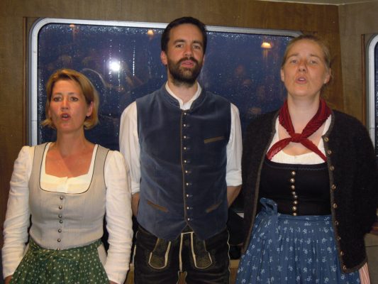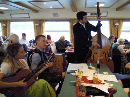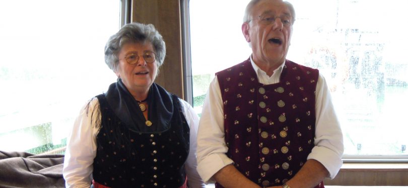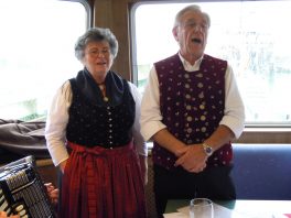 Es gehört schon zum „Standardprogramm“, dass jedes Mal ein oder zwei Gesangs- bzw. Musikgruppen aus dem Salzburger Land auf der „Edeltraud” mit dabei sind, so auch diesmal. Der InHofer Dreigesang, also Simone Kiesenhofer, früher Lindmair , aus dem in der Gegend von Mondsee gelegenen „In Hof“ zusammen mit Magdalena und Ruapp Reindl aus Kuchl hatte einmal mehr „handverlesenes“ Liedgut im Gepäck. Ruhig bis pietätvoll und dann aber wieder kreuzlustig sprudelnd wie ein Schmelzwasserbach im Frühjahr, so könnte man ihren fein aufeinander abgestimmten Liedvortrag beschreiben. Dass sie im Moment zu den meist gesuchtesten Gesangsformationen im gesamten deutschsprachigen Alpenraum gehören verwundert deshalb nicht. Hatten sie doch auch mit der Hellbrunner Geigenmusik eine Instrumentalgruppe an ihrer Seite, die jede Nuance einer versierten Gesangsbegleitung beherrscht. Da musizieren ganz große Könner miteinander, die trotz ihrer jugendlichen Frische bereits an die ganz großen Vorbilder vergangener Zeiten heranreichen. Die Zuhörer waren hellauf begeistert von diesem, bei uns leider noch zu selten gehörten Ensemble. Alles in Allem wieder ein volksmusikalischer Genuss, diese Fahrt mit der „Edeltraud“ auf den der Himmel über weite Strecken „Freudentränen“ regnen ließ.