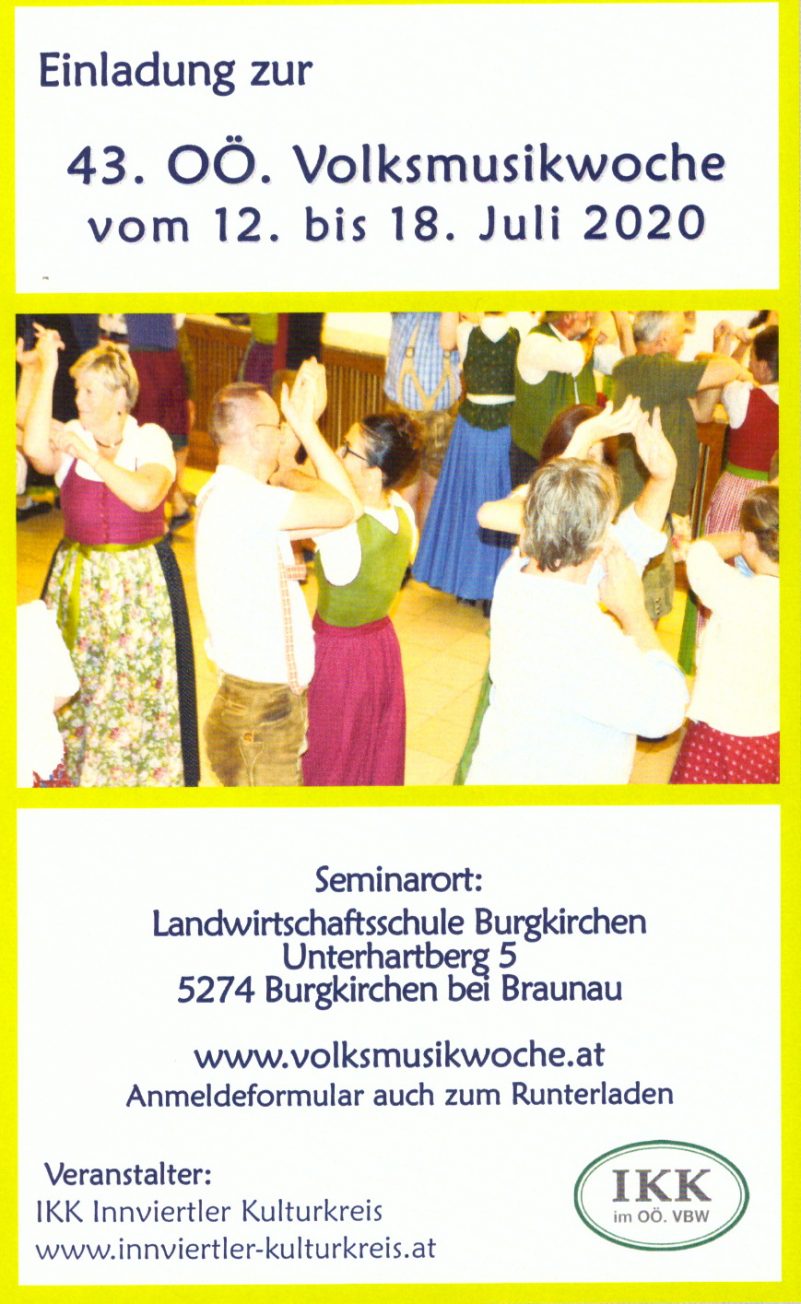 Die 43. Oberösterreichische Volksmusikwoche findet heuer vom 12. bis 18. Juli in der Landwirtschaftsschule Burgkirchen bei Braunau statt. Veranstalter ist der Innviertler Kulturkreis, das Anmeldeformular sowie das gesamte Programmangebot findet sich auf www.volksmusikwoche.at.