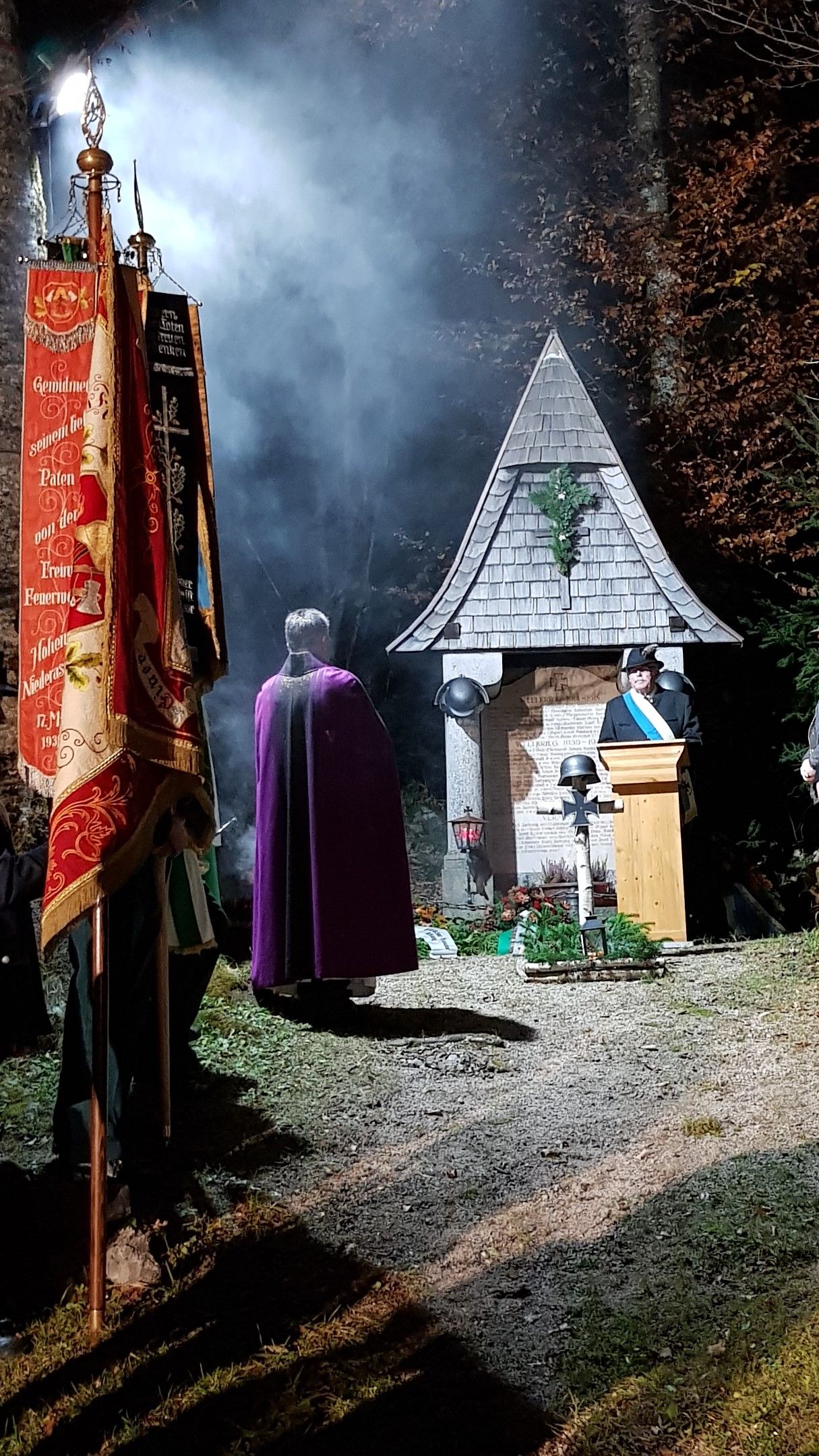 Pfarrer Paul Janßen hielt das Libera zum Gedenken für die Gefallenen, Vermissten und Verstorbenen der ehemaligen Gemeinde Sachrang am Kriegerdenkmal. Der zweite Bürgermeister Michael Andrelang und der Vorsitzende der Krieger- und Soldatenkameradschaft Sachrang Bernd Wagner legten für die Gemeinde Aschau und die KSK Sachrang Kränze zum Gedenken nieder. 62 Gefallene und Vermisste hatte der Ort in den beiden Weltkriegen zu verzeichnen.