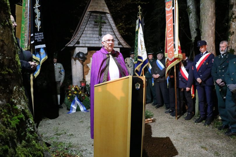 Bericht und Fotos: Heinrich Rehberg – Pfarrer Hermann Overmeyer hielt das Libera, Gerd Kalckbrenner und Bürgermeister Peter Solnar legten Kränze zum Gedenken für die Gefallenen, Vermissten und Verstorbenen der ehemaligen Gemeinde Sachrang am Kriegerdenkmal nieder. 62 Gefallene und Vermisste hatte der Ort in den beiden Weltkriegen zu verzeichnen.