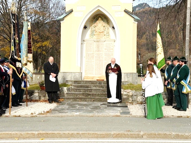 Pfarrer Josef Kreuzpointner zelebrierte die Messe gemeinsam mit Diakon Erik Oberhorner zum Volkstrauertag. Gemeinsam -unter den Klängen der Musikkapelle- schritten die Besucher nach der Messe den Weg zum neuen Friedhof, wo das Schlechinger Kriegerdenkmal steht mit den in Stein gemeißelten Namen der Gefallenen und den Opfern der Kriege.