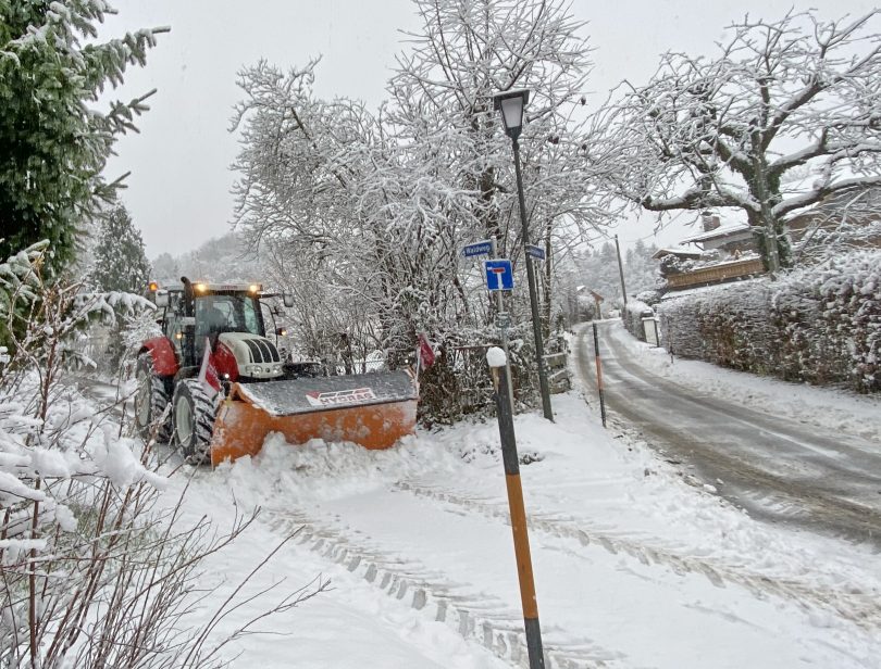 Ein schneereicher Wintertag beschert dem gemeindlichen Bauhof von Prien einen Voll-Einsatz-Tag. Wie Bauhofleiter Richard Zettl informierte, sind dann aufgrund der anhaltenden Schneefälle alle 15 Fahrzeuge für den Räum- und Streudienst im Einsatz. Die Einsatzgebiete sind in verschiedenen Räumungs- und Streustrecken eingeteilt, so dass zu gleichen Zeiten Geh- und Radwege sowie Straßen und Parkplätze vom Schnee befreit werden können. „Heute haben wir einen nassen, schweren und glattmachenden Schnee, der besondere Vorsicht auch für die Autofahrer verlangt“, so der Bauhof-Leiter. Unterstützt werden das gemeindliche Personal und der Fuhrpark des Bauhofs zusätzlich von einem Lohnunternehmer. So ist Markus Holdinger mit seinem Steyr-Bulldog ebenfalls unterwegs und eingeteilt. Für ihn begann der Räumdienst um 3 Uhr in der Früh, von seinem Einsatz diese aktuellen Bilder vom Waldweg in Prien-Prutdorf.