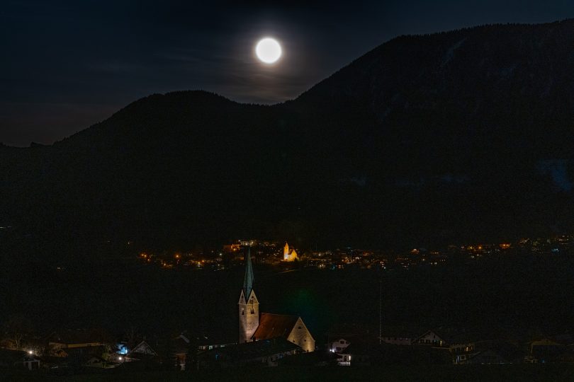 Eine besondere Feierabend- oder Abend-Stimmung hat sich am Montagabend für die Bewohner vom Samerberg gezeigt als der volle Mond über den heimatlichen Bergen aufstieg und mit seinem Licht über die Hauptorte Grainbach und Törwang das gesamte Hochplateau beschien. Das Zusammentreffen verschiedener Komponenten ist relativ selten, damit eine solch stimmungsvolle Aufnahme gelingt.