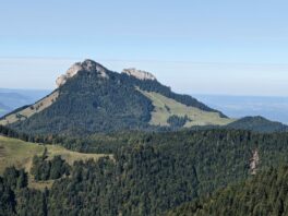 Heraus aus dem Wald verlassen wir die Almstrasse und steigen auf einem nur schwach erkennbaren Pfad, der aber in der amtlichen Topographischen Karte eingezeichnet ist, hinauf zu unserem Ziel, dem Altkaserkogel (1280 m). Das Panorama ist grandios, man sieht vor den Gipfeln des Mangfallgebirges das Kranzhorn, den Pastaukopf und Kitzstein, Heuberg und Wasserwand mit der darunterliegenden Daffnerwald Alm. Der Blick schweift auch weit hinaus ins Voralpenland und zum nahen Spitzstein mit der darunterliegenden Nesselbrandalm.