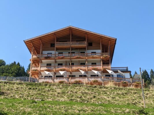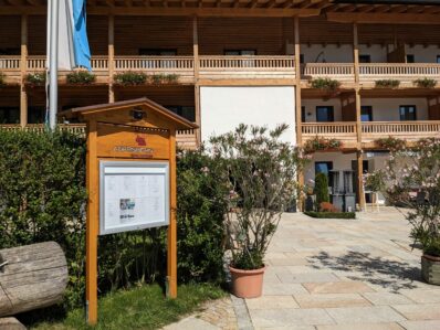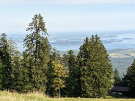 Wir starten in Adersberg, wo ein schöner Höhenrundweg beginnt. Am Wanderparkplatz bei dem Berggasthof steht erst ein einziges Auto und auch auf dem gesamten Rundweg begegnet uns nur eine Handvoll Wanderer und zwei Mountainbiker. Von Adersberg gehen wir anfangs steil, später etwas moderater bergauf. Der Weg ist aussichtsreich, bald gibt es schöne Ausblicke auf den Chiemsee. Wir kommen zu einer Bank mit grandiosem Blick in die Berge, greifbar nah die Gedererwand und die Kampenwand. Wir nehmen sie in Beschlag und genießen eine Weile die Ruhe und die schöne Landschaft.