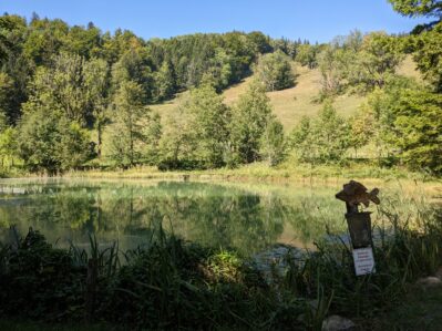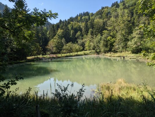 Nachdem wir unseren Durst gelöscht und uns mit einer Brotzeit gestärkt haben, laufen wir gemütlich auf breiten Almstrassen durch schattigen Wald und vorbei an einem idyllischen Weiher, zurück nach Adersberg.