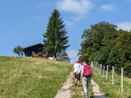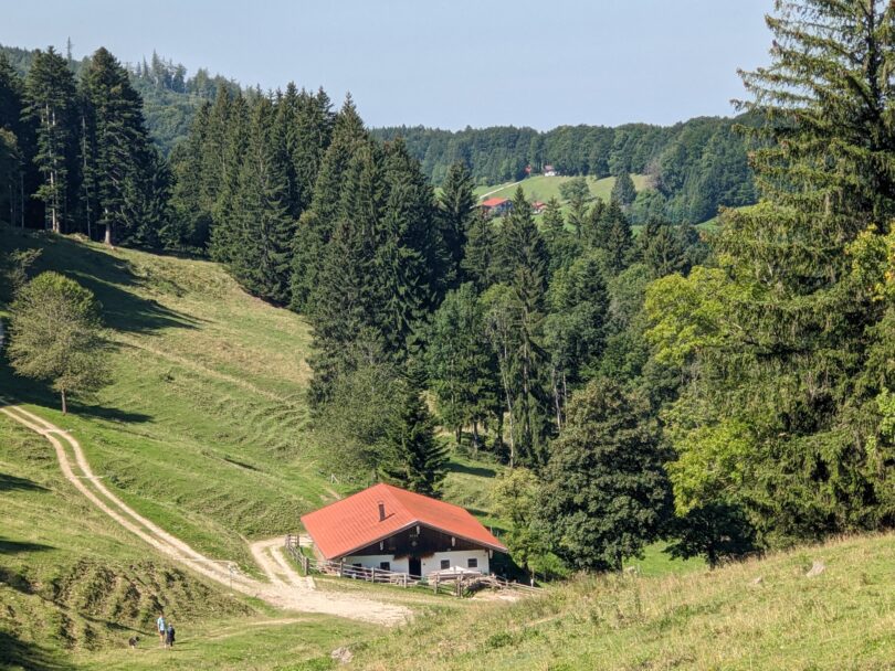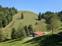 Dann geht´s weiter zur Unteren Lindlalm, eine herrlich gelegene private, nicht bewirtschaftete Alm. Wir machen einen kurzen Abstecher zur Oberen Lindlalm, einer weiteren privaten Hütte. Gleich nach der Hütte befindet sich eine Bank mit Blick weit hinaus ins Alpenvorland. Wir setzen uns kurz und versuchen die Ortschafte von Frasdorf bis hinüber nach Bad Endorf zu identifizieren, besonders markant sticht die Kirche St.Florian bei Greimelberg ins Auge. Zurück auf dem Weg zur Lindlalm schweift der Blick vom Hochfelln, Hochgern über Hochplatte, Friedenrath, Gedererwand und Kampenwand bis hinüber zum Klausenkamm und der Hochries. Von der Lindlalm wandern wir dann wieder auf dem Höhenrundweg bergab über offene Almwiesen und kommen zu einem Wegweiser. Hier verlassen wir die Adersbergrunde und machen den kleinen Umweg auf einem holprigen schmalen Pfad hinunter zur urigen Herrenalm, auf der Wanderer von Ende Mai bis Mitte September einkehren können.