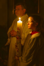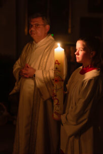 Angeführt von der Osterkerze und begleitet von Gesängen wie dem Exsultet, zieht die Gemeinde in einer feierlichen Prozession in die dunkle Kirche ein. Die Gläubigen tragen Kerzen, die vom Licht der Osterkerze entzündet wurden.